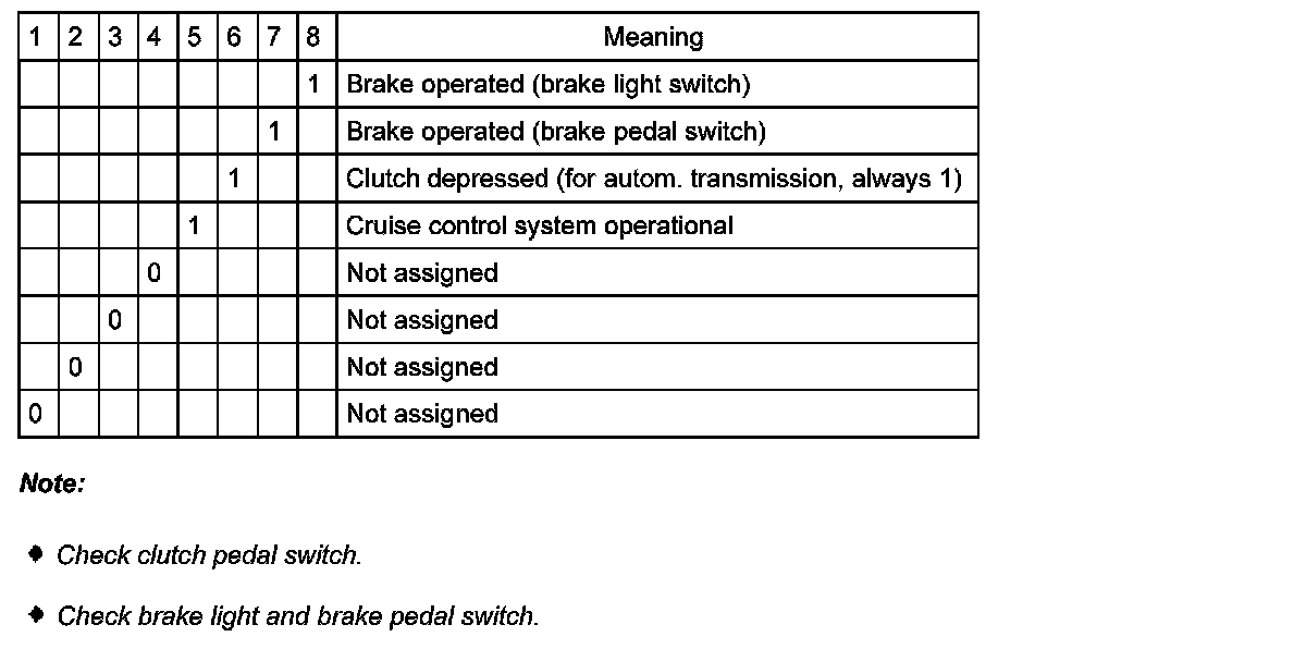 Explanation of digits in 8-digit indication, display field 2, switch for brakes, clutch and cruise control.