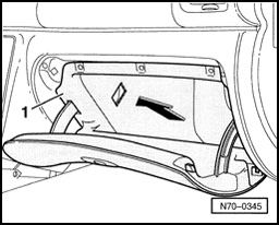 - Pull storage compartment on passengers side - 1 - out of instrument panel - arrow -.