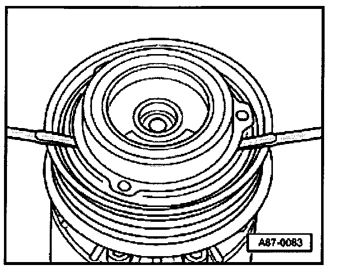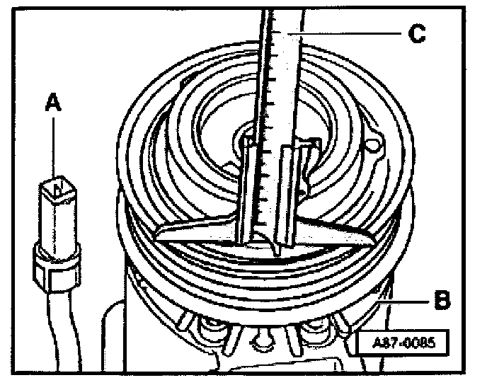 - Using depth gauge -C-, measure gap between top of clutch plate and belt pulley at three equally spaced locations (measurement must not deviate).