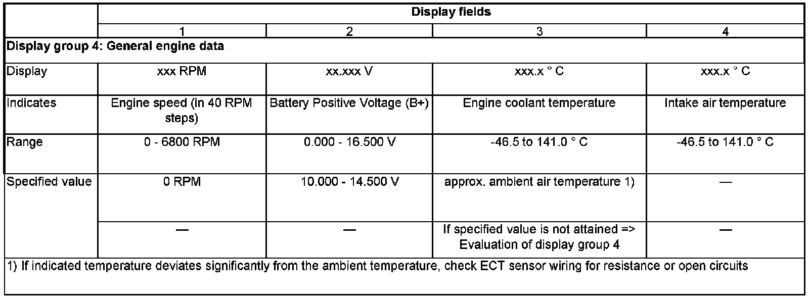 - Compare display with specified value for engine coolant temperature sensor (display field 3):