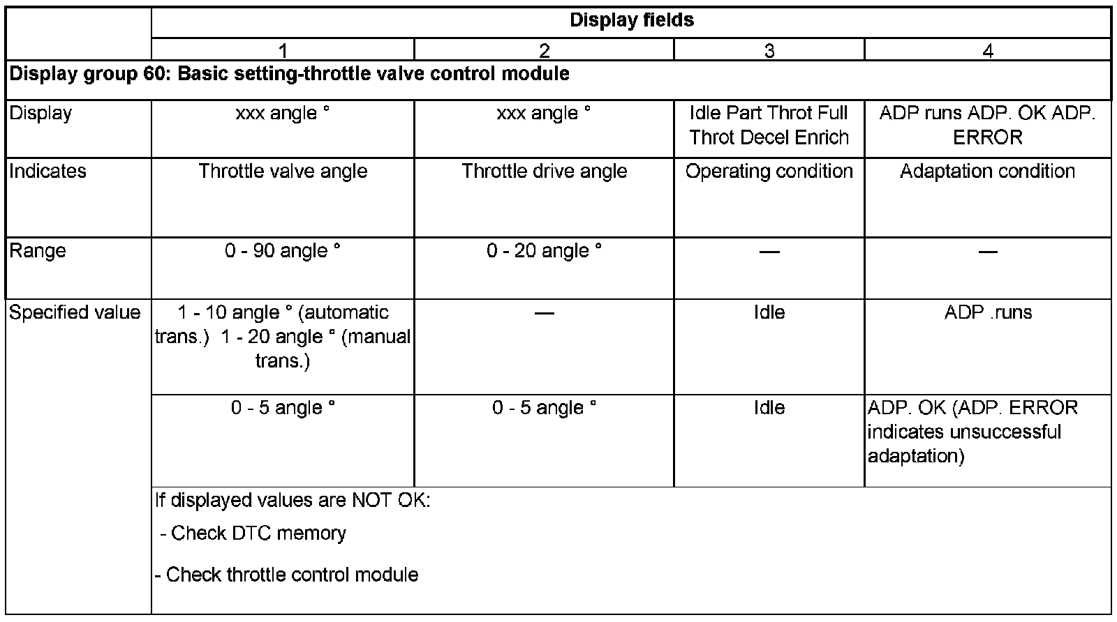 After confirming in put of display group 60, adaptation is started. The Throttle Position (TP)sensor is positioned in the closed throttle, wide open throttle and limp-home positions. Following this procedure, other intermediate steps will create a characteristic curve of the relationship between Throttle Position (TP) sensor-G69- and angle sensor for throttle drive -G187-.