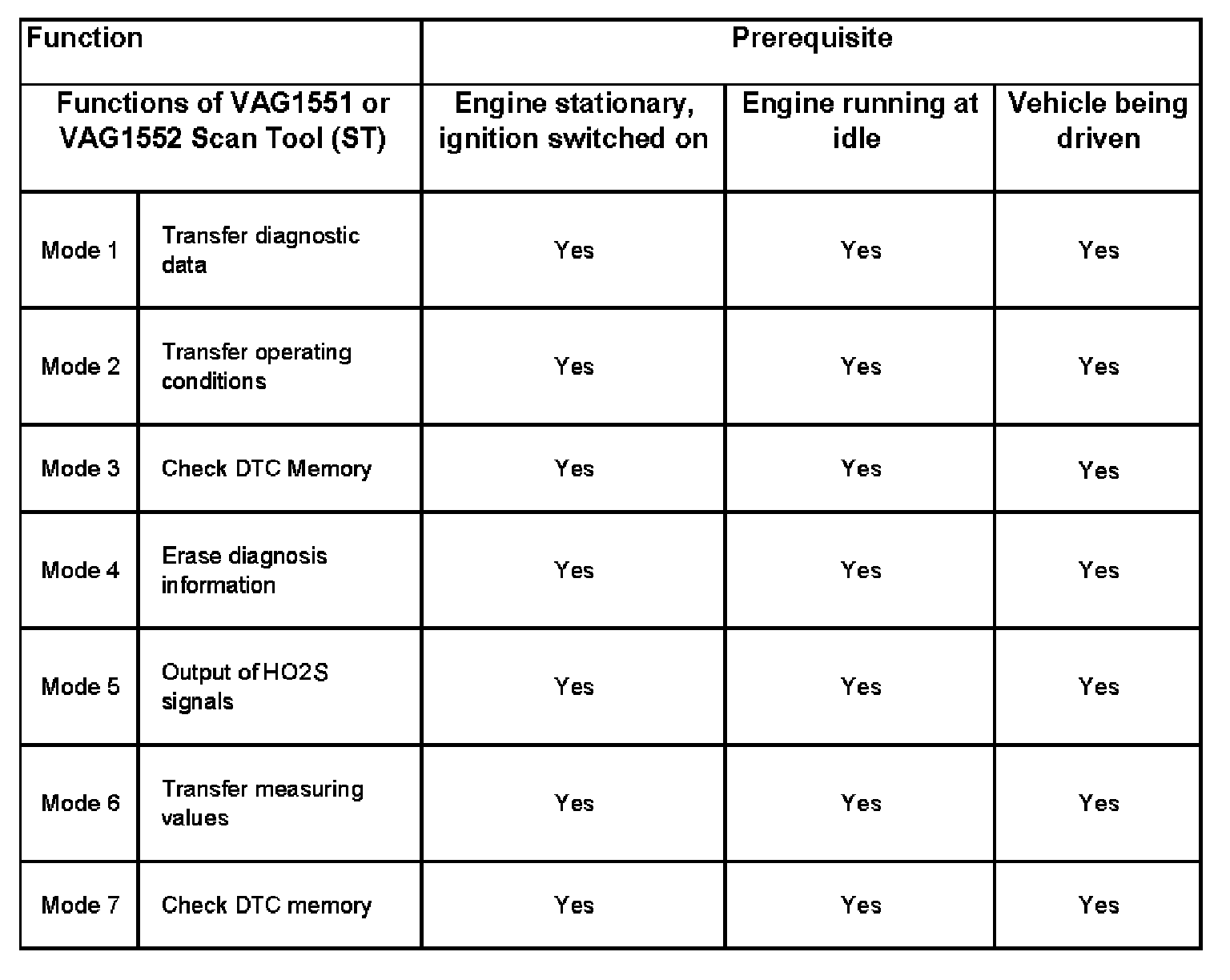 - Mode 5 shows the statistical value of the oxygen sensors as mandated by law. As these values have no direct bearing on oxygen sensor diagnosis, Mode 5 is of no particular value in a Volkswagen Service department.