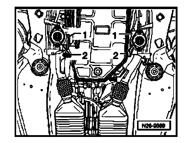 - Remove rear bolts -1 and - 2 of subframe on both sides of vehicle.
