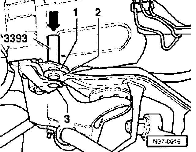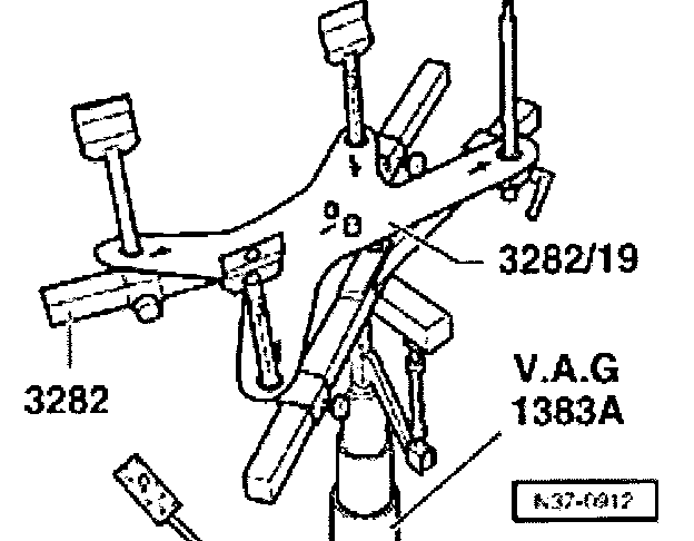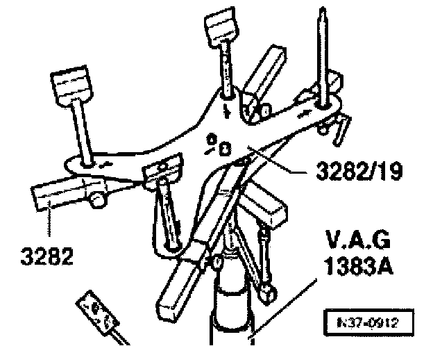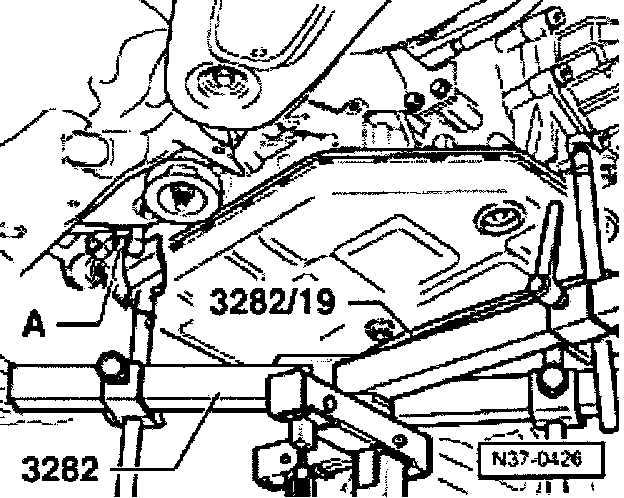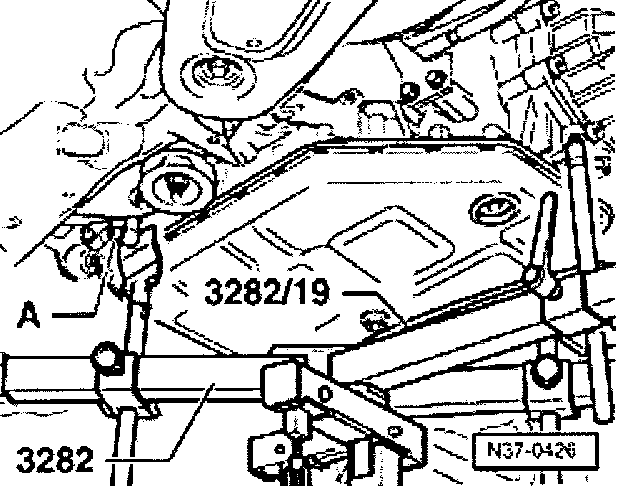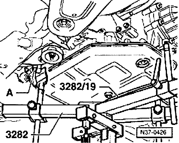 - Move jack VAG 1383A with transmission support 3282 under the transmission, align adjusting plate parallel to transmission and support transmission.