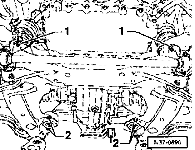 - Unscrew bolts -1- and -2- at rear of subframe on both sides of vehicle.