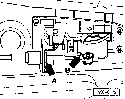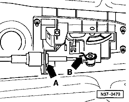 - Pull down locking plate -A- (for securing selector lever cable to mounting bracket) and remove.