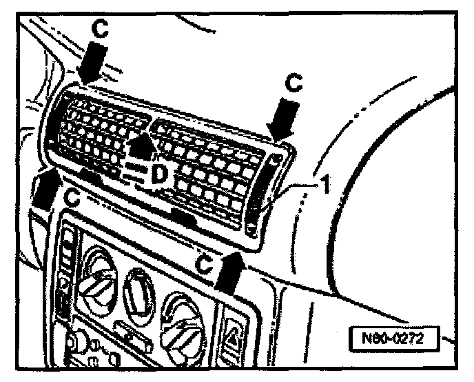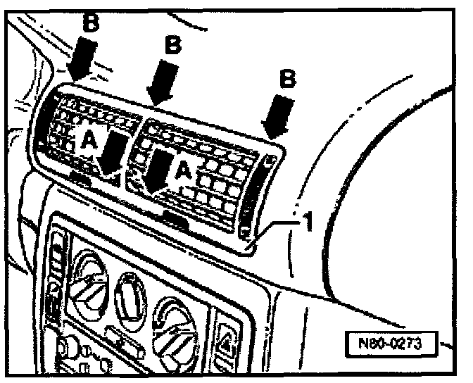 - Insert fingers of both hands into lower row of grille -A- and push center vent -1- down suing force until locking lugs -B- are released from their mounts.