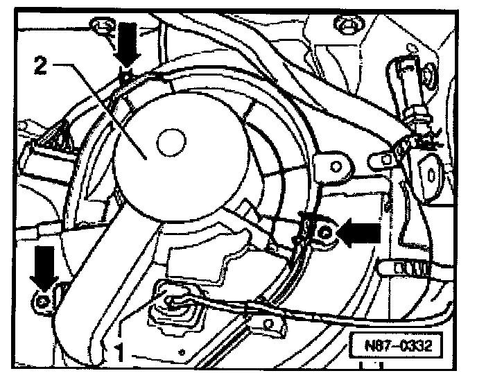 - Remove three screws -arrows- and remove fresh air blower -2- downwards.