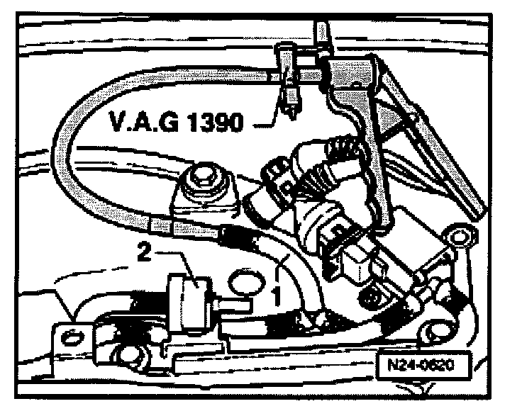 - Disconnect vacuum hose (1) from check-valve (2) and connect hand vacuum pump VAG 1390 to disconnected hose.