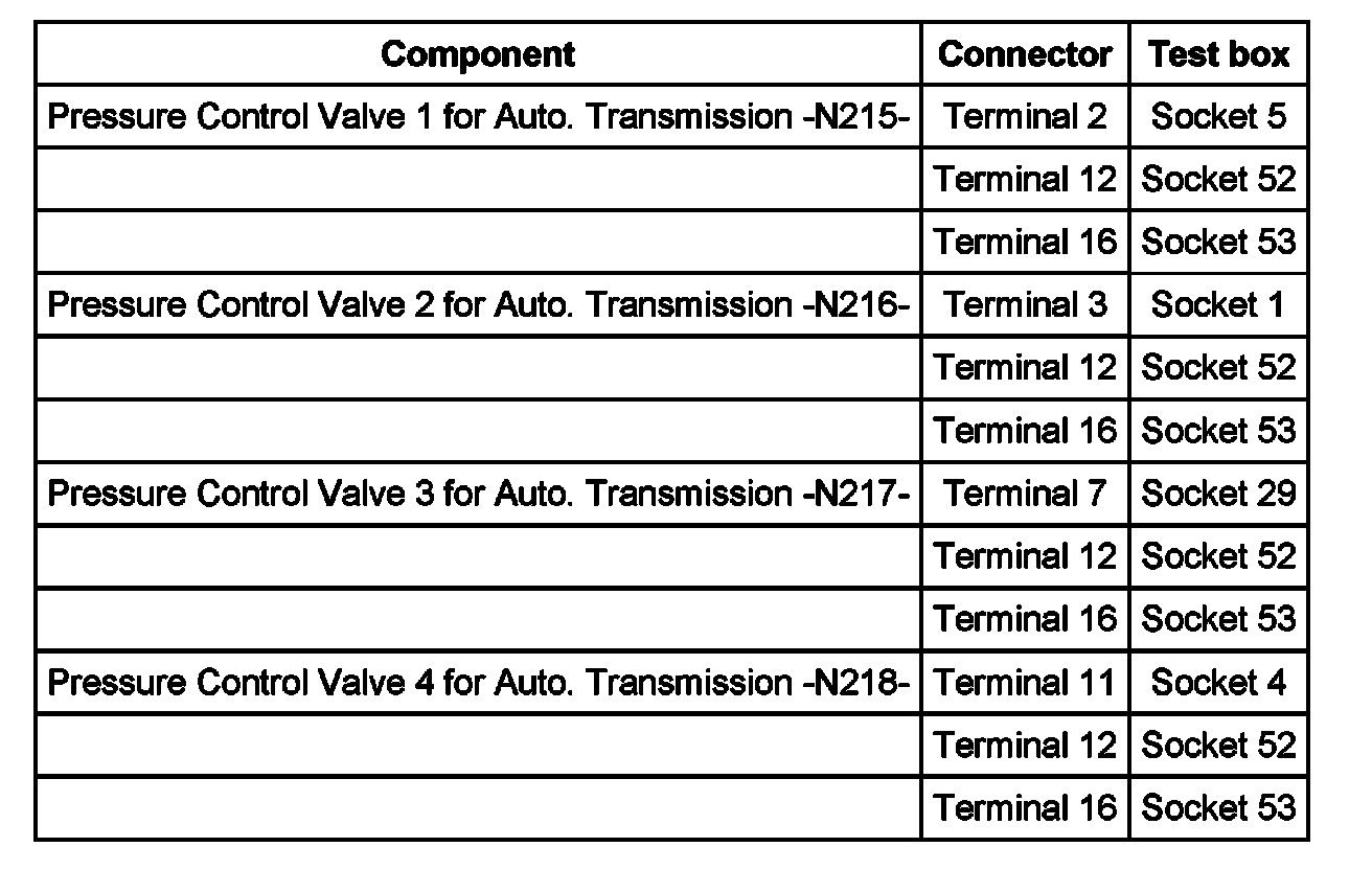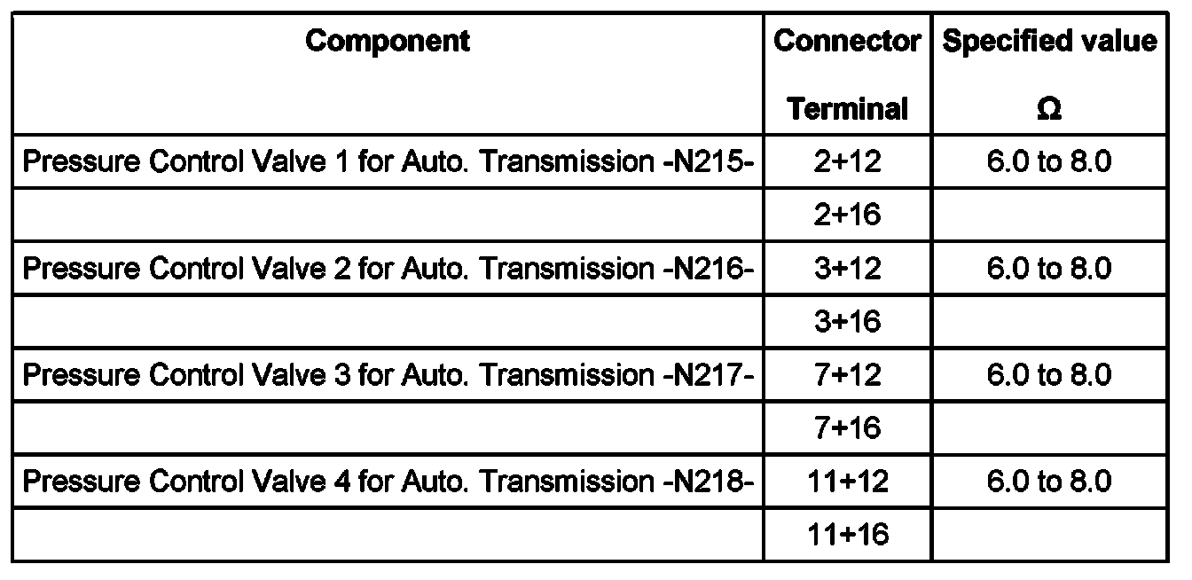 - Check resistance of Pressure Control Valve 1 for Auto. Transmission -N215- through Pressure Control Valve 4 for Auto. Transmission -N218- at 16-pin connector to transmission.