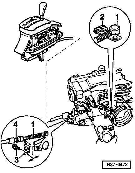 - Separate selector lever cable -3- from mounting bracket as follows: