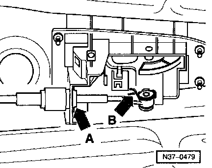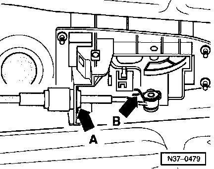 - Pull down locking plate -A- (for securing selector lever cable to mounting bracket) and remove.