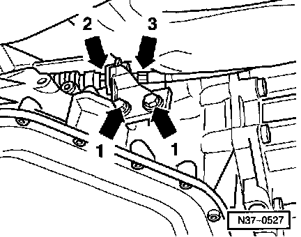 - Tighten bolts securing support bracket to transmission (arrows -1-) (counterhold at hex (arrow -3-) and secure selector lever cable to support bracket (arrow -2-), using torques as specified.