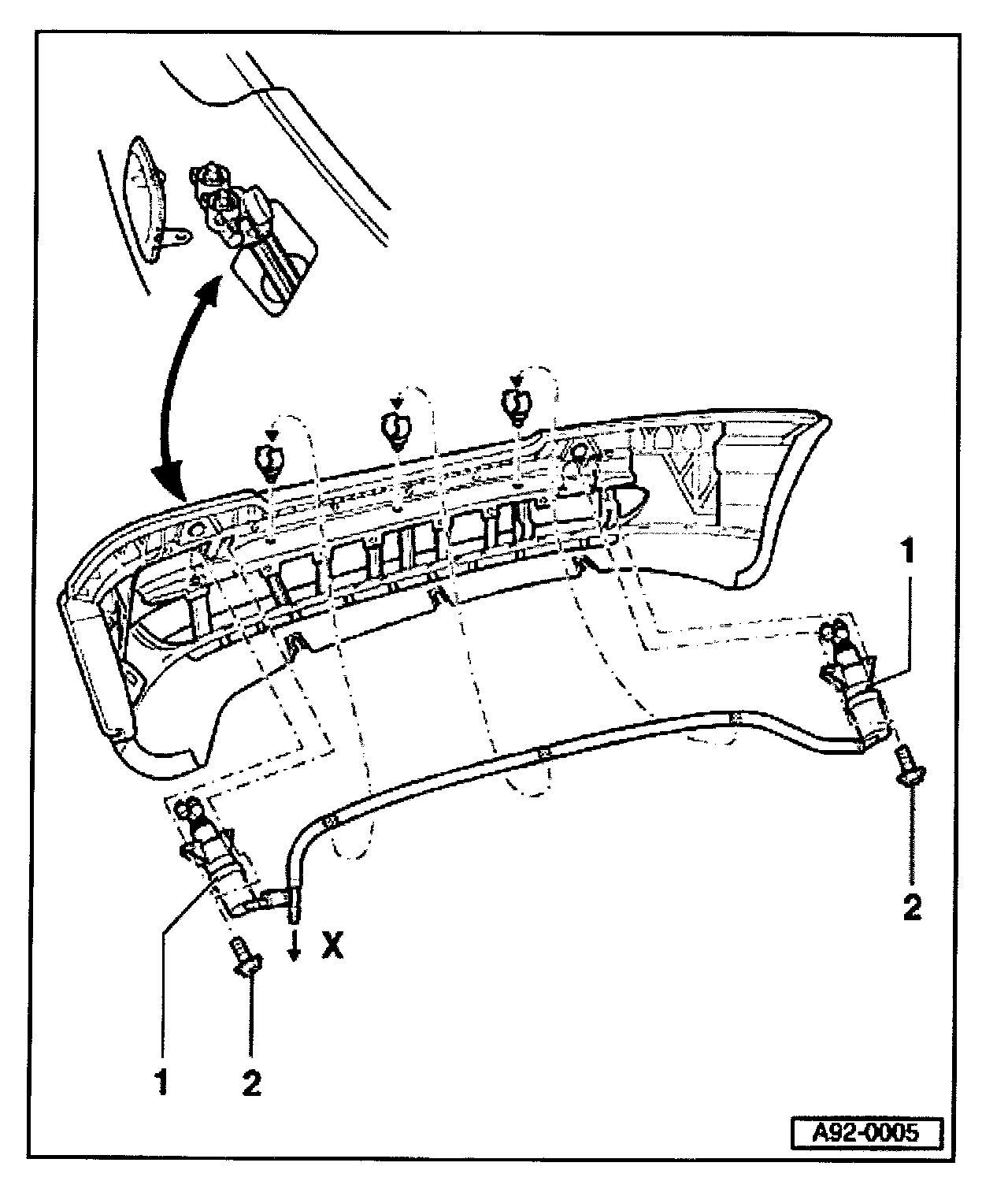 - The front bumper cover must be removed to reach the headlight washer system components illustrated.