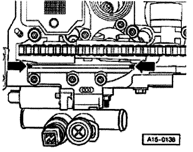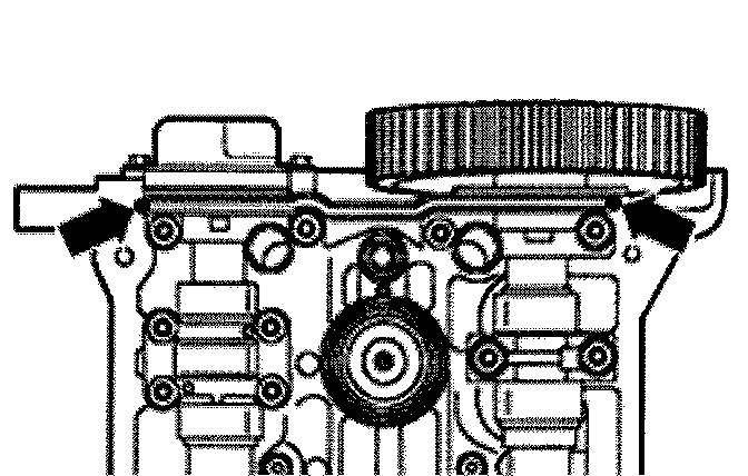 - Carefully apply a thin coat of sealant D 454 300 A2 to half-moon shaped surface and both edges of sealing surfaces between camshaft adjuster and cylinder head (arrows) using a small screwdriver.