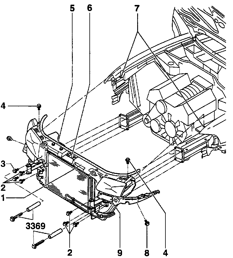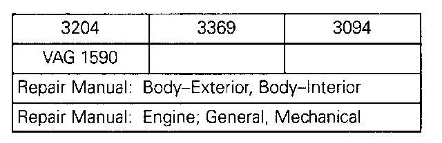 - Remove bolt -3- and screw special tool 3369 onto right and left-hand longitudinal members.