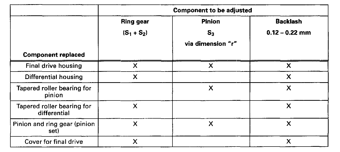 Adjustment overviewNote: If repairs have been carried out to the transmission it is only necessary to adjust the ring gear, pinion or complete gearset if components have been replaced which have a direct effect on the adjustment of the final drive. Refer to the Image to avoid unnecessary adjustment: