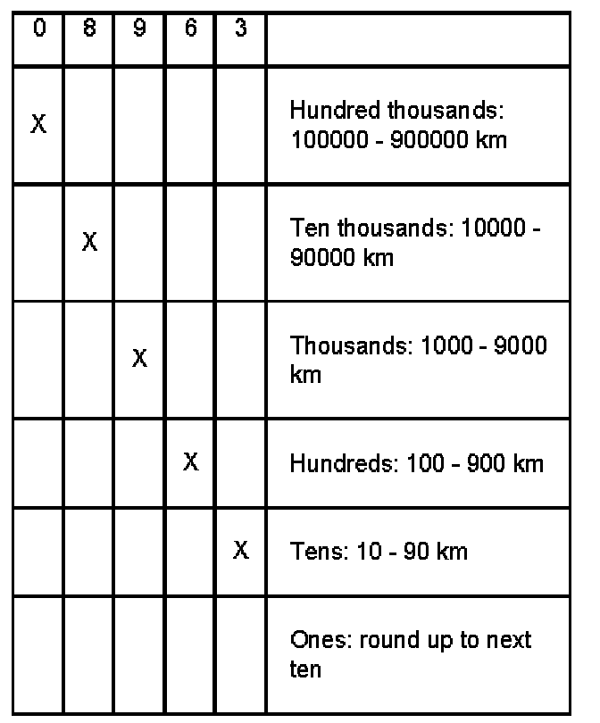 The last position of the kilometer reading must be rounded off to the nearest 10 kms. A kilometer reading of 89627 produces an adaptation value of: