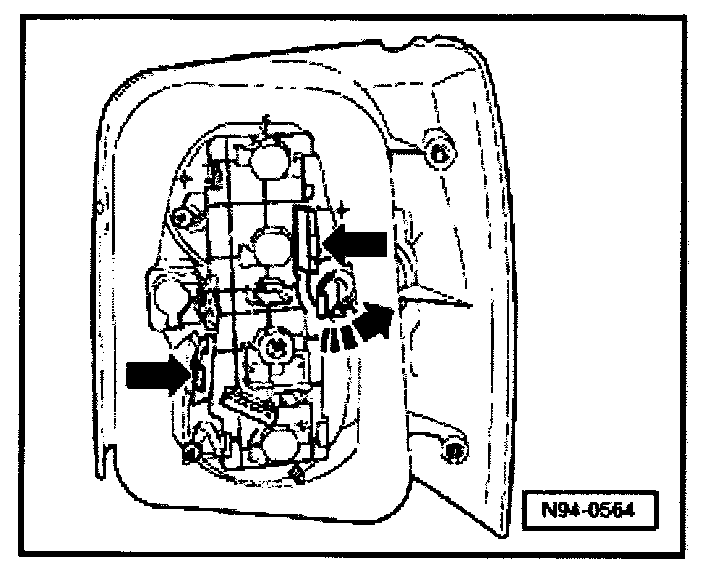 - Depress retainer tabs -arrows- and remove bulb holder to rear.