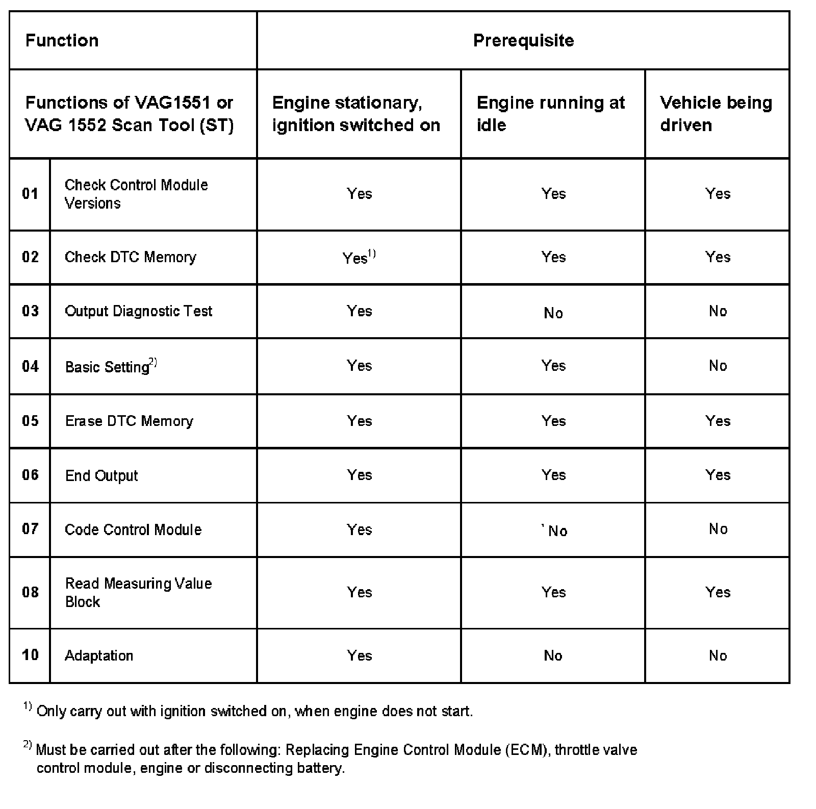 ECM Functions Using VAG1551 Scan Tool Or VAG 1552 Scan Tool
