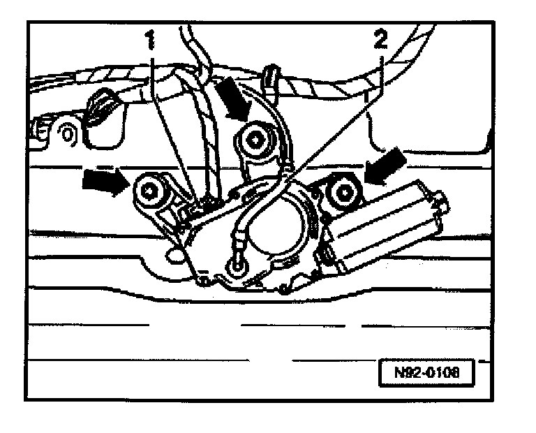 - Unscrew hexagon nuts -arrows- and remove wiper motor.