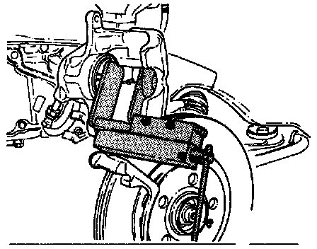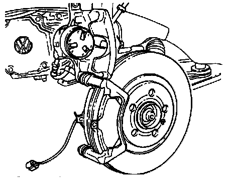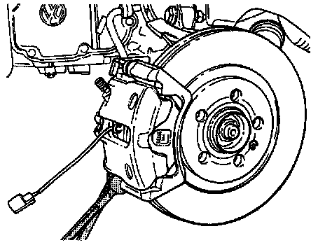 ^ Do not allow the caliper to hang by the brake hose. The unsupported weight can stretch and damage the hose.