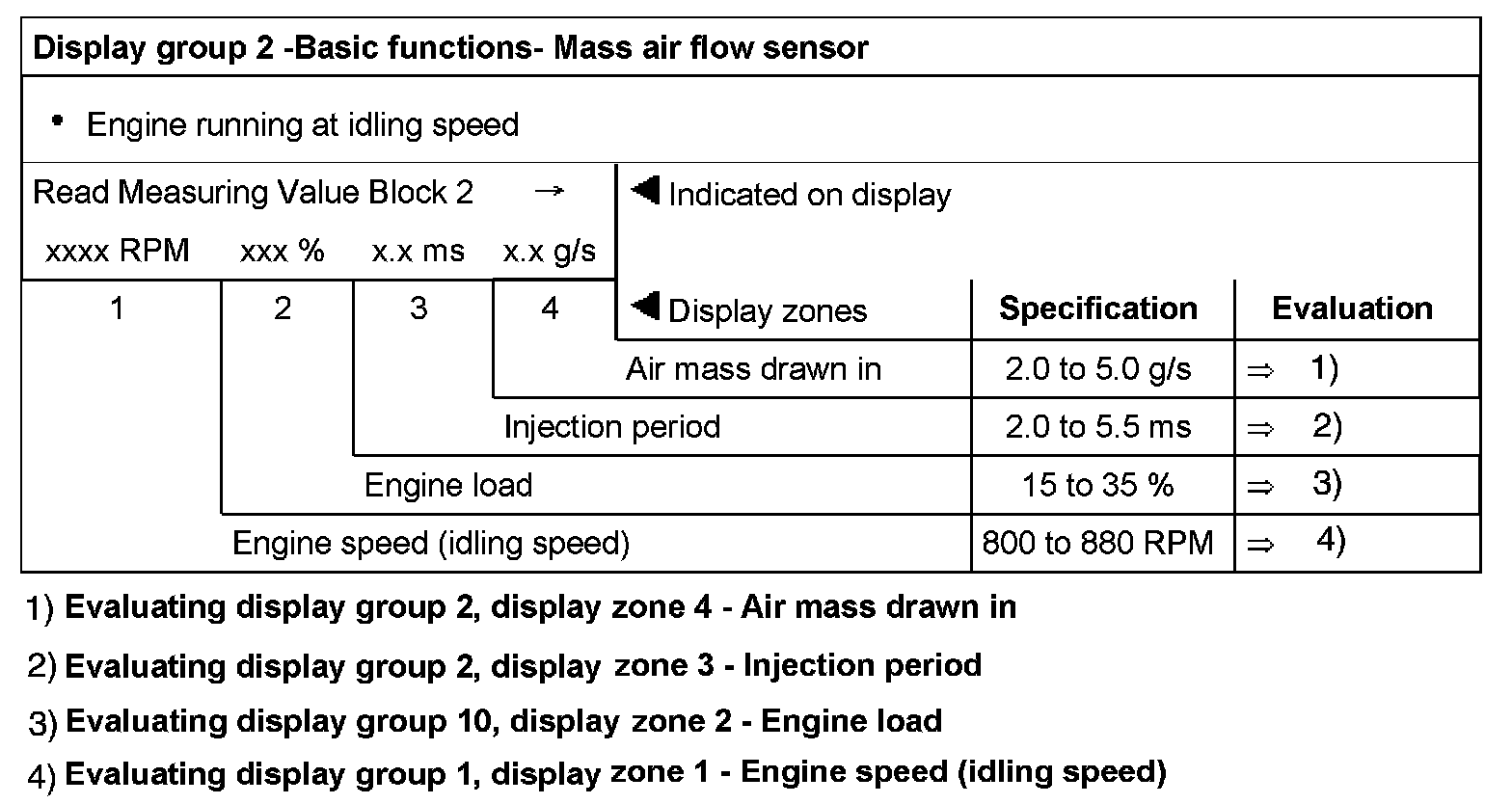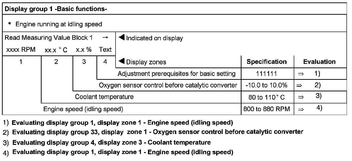 Evaluating display group 1, display zone 1 - Engine speed (idling speed)