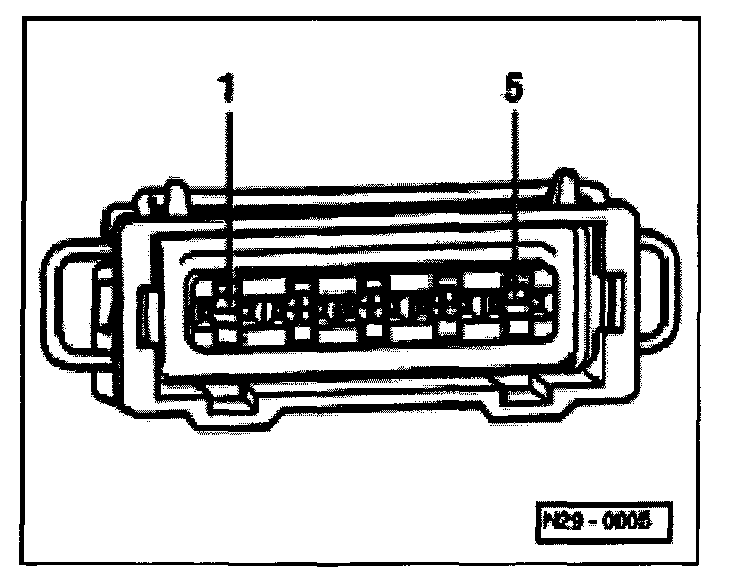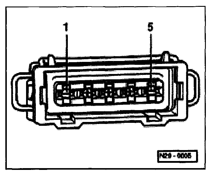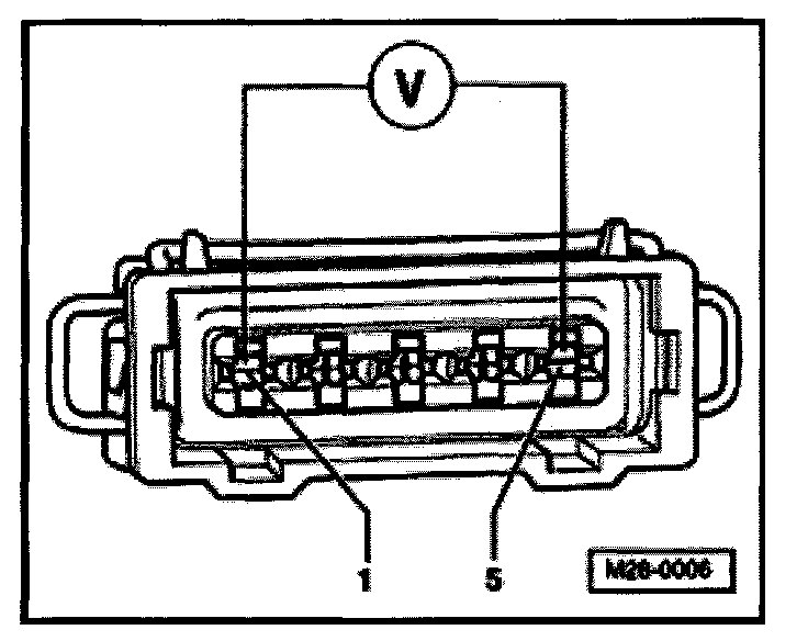 - Using multimeter and adapter cables from VW1594, measure supply voltage between terminals 1 + 5 of disconnected harness connector.