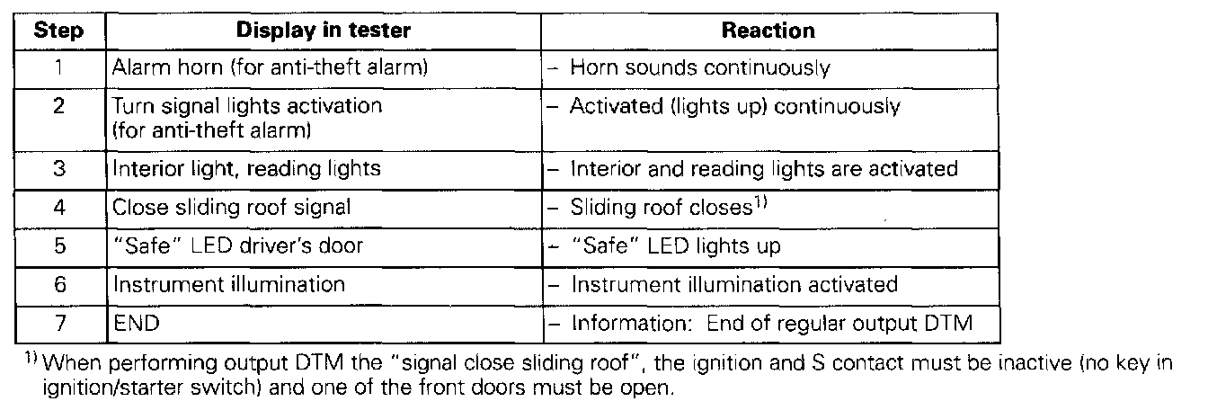 The components displayed in the output Diagnostic Test Mode (DTM) can differ depending upon the equipment installed to the vehicle. For example, on vehicles without an Anti-Theft Alarm there will be no step "1" as listed in the image below.