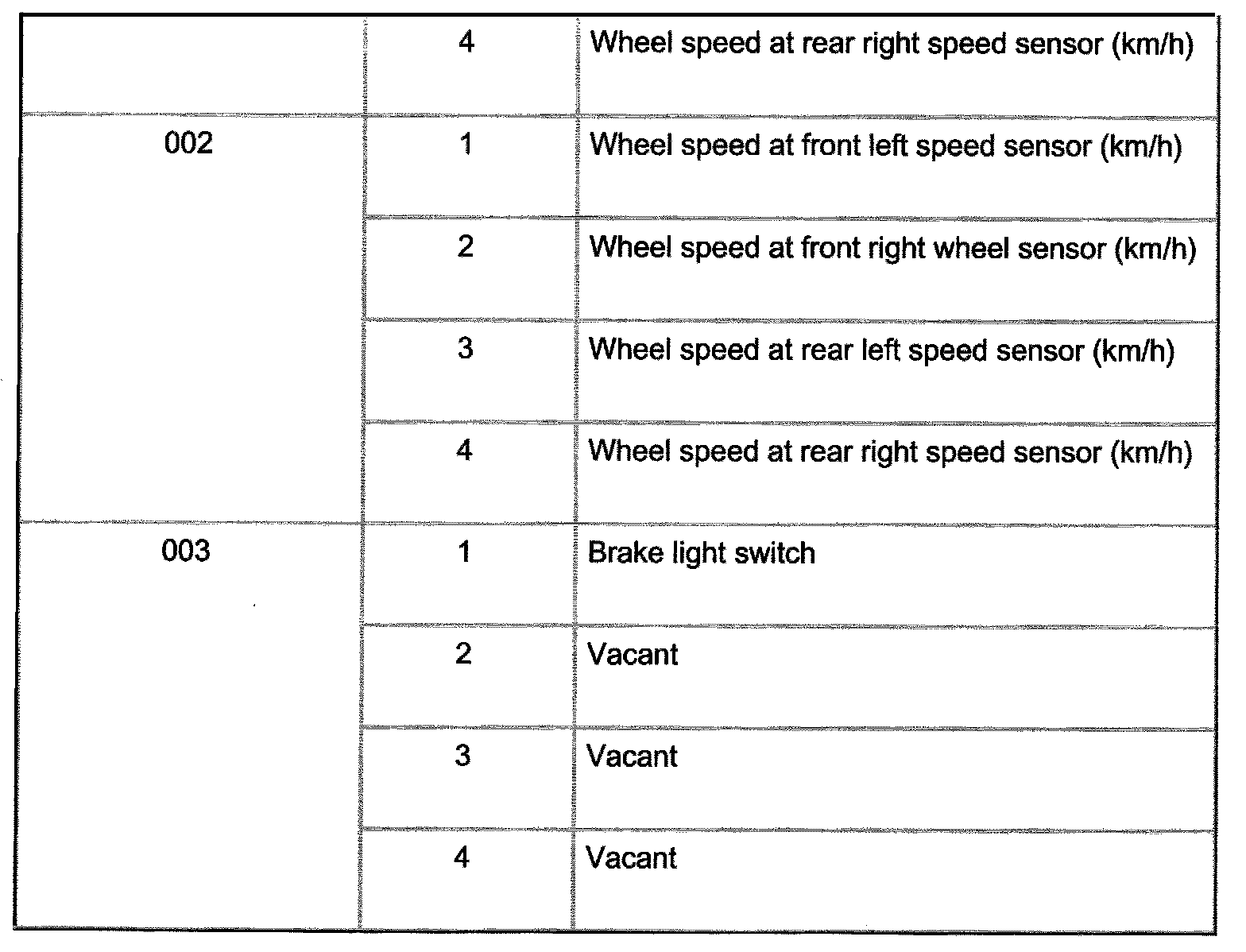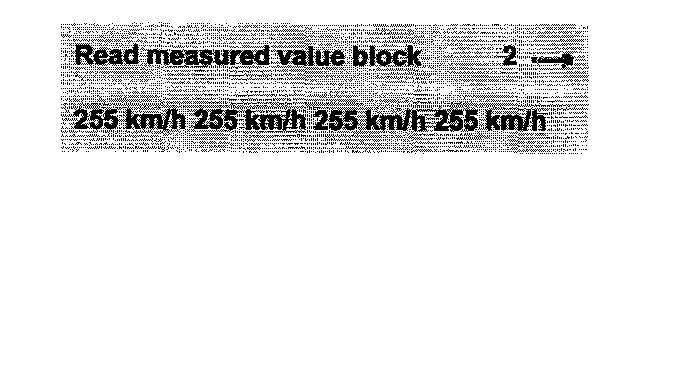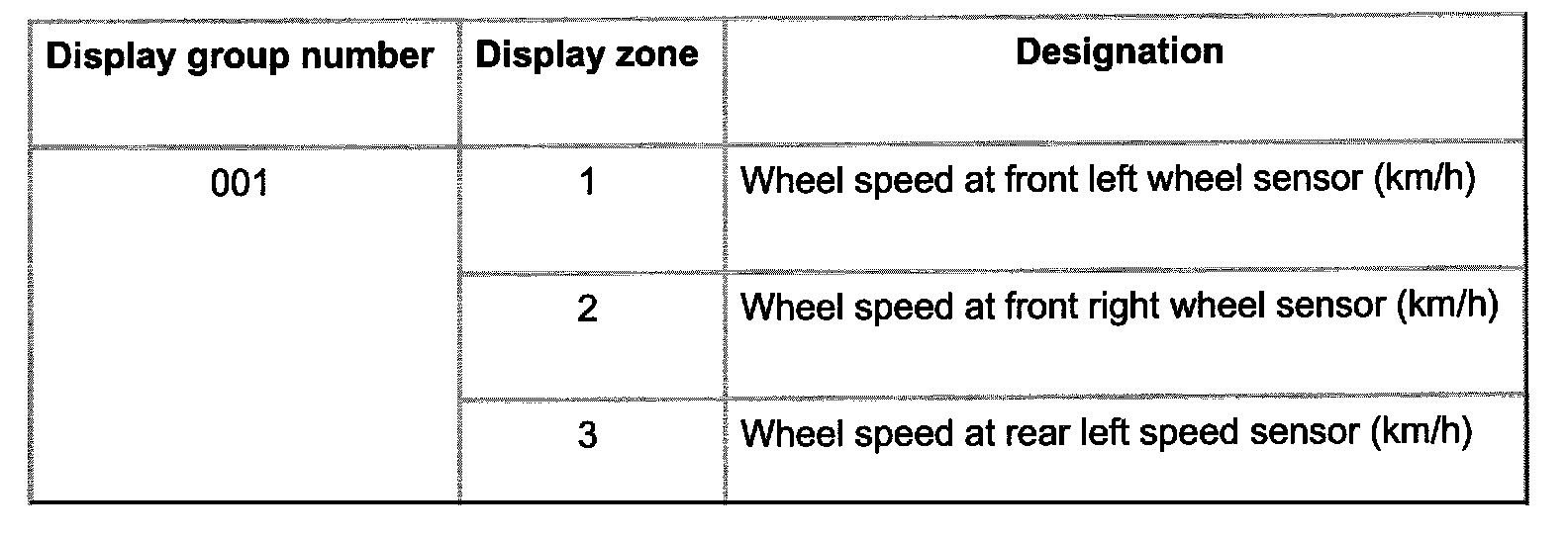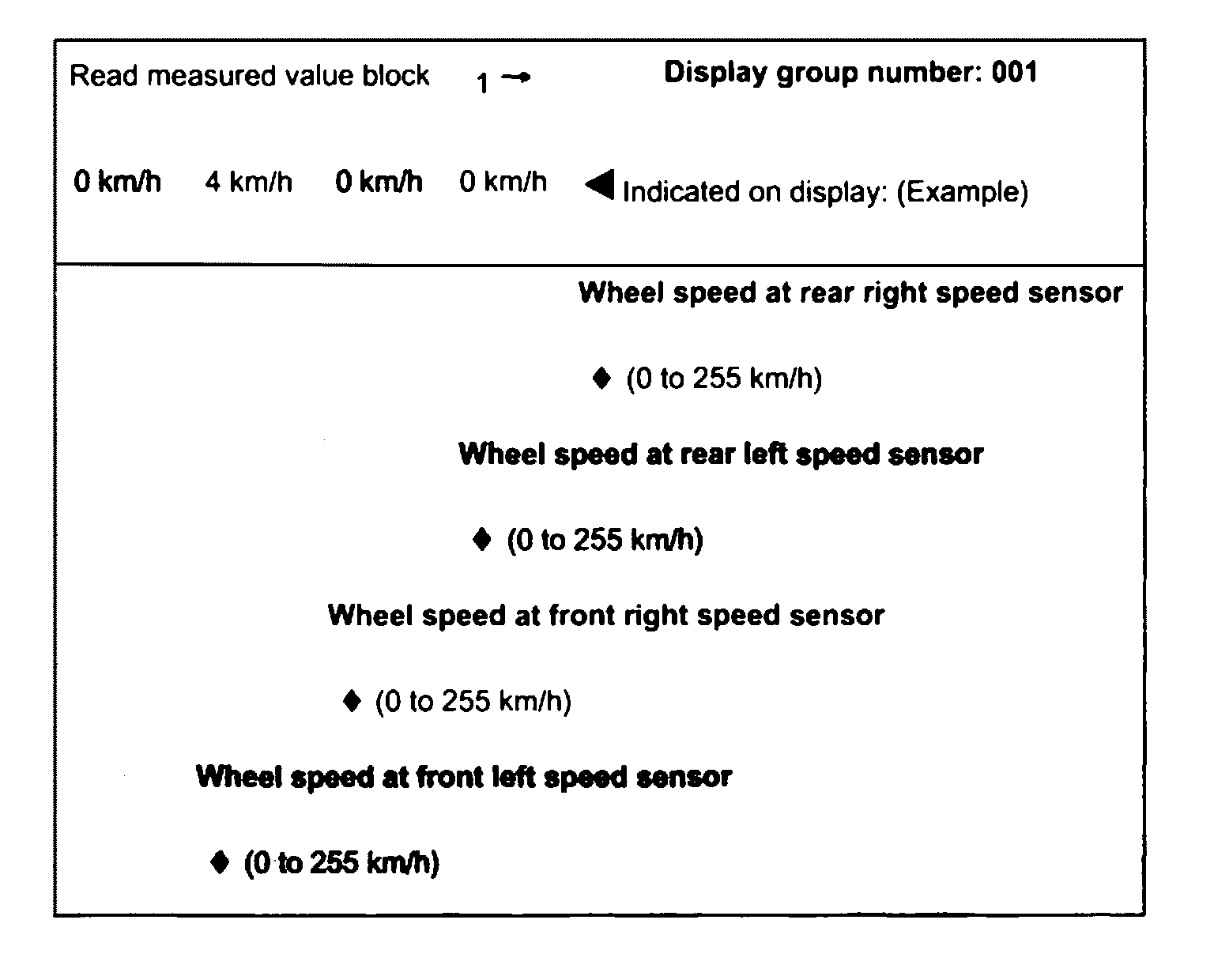 The actual wheel speeds are displayed. They serve to check the speed sensor allocation to the wheel. (The vehicle must be raised and the wheel must be rotated by hand by a 2nd mechanic).