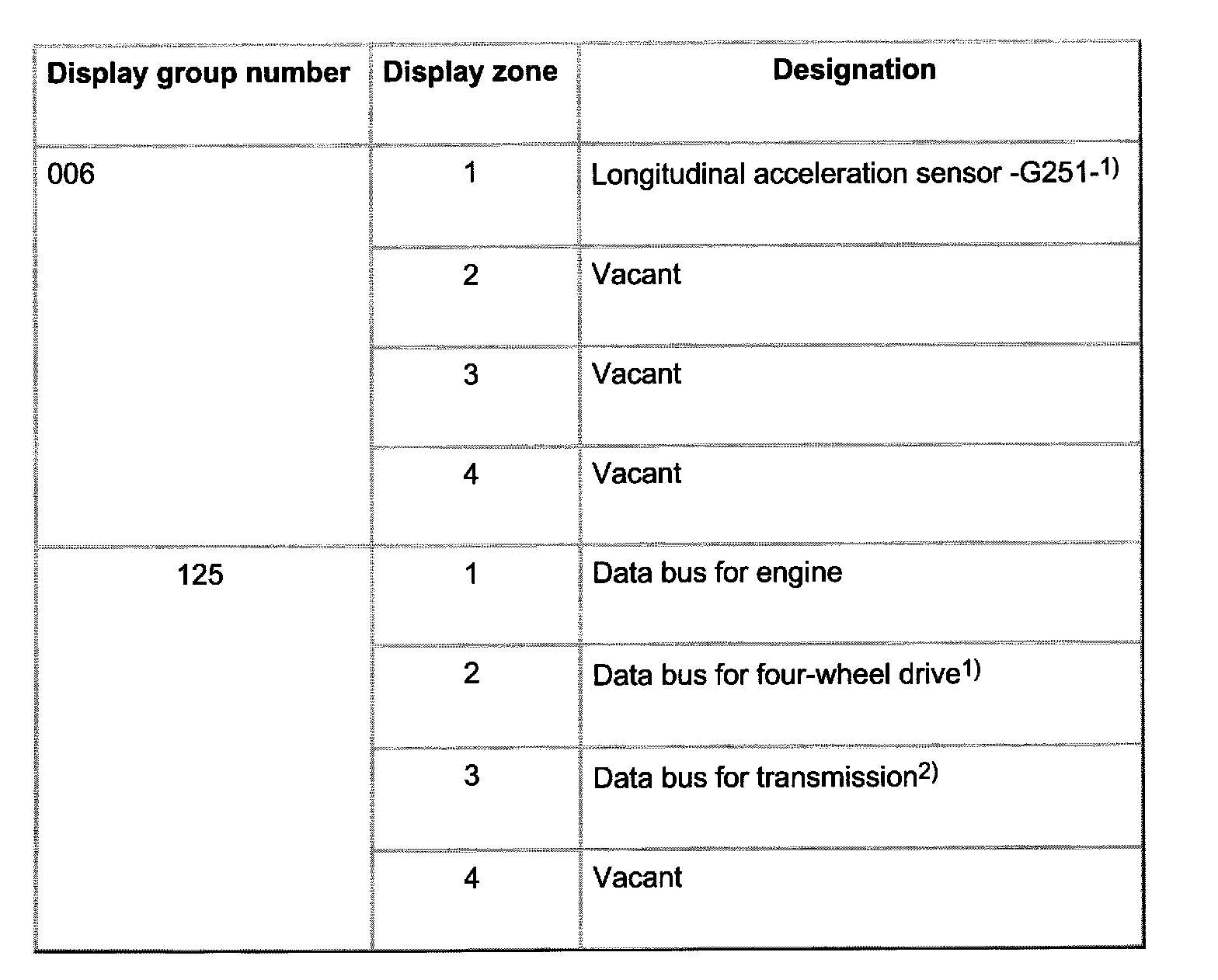 The control module can transfer a considerable amount of test data. This test data delivers information on the operational condition of the system and/or sensors connected to it. In many cases the transferred test data supports troubleshooting and repair. The test data has been summarized into single display groups because all the information cannot be evaluated at the same time. The information can be selected via display group numbers.