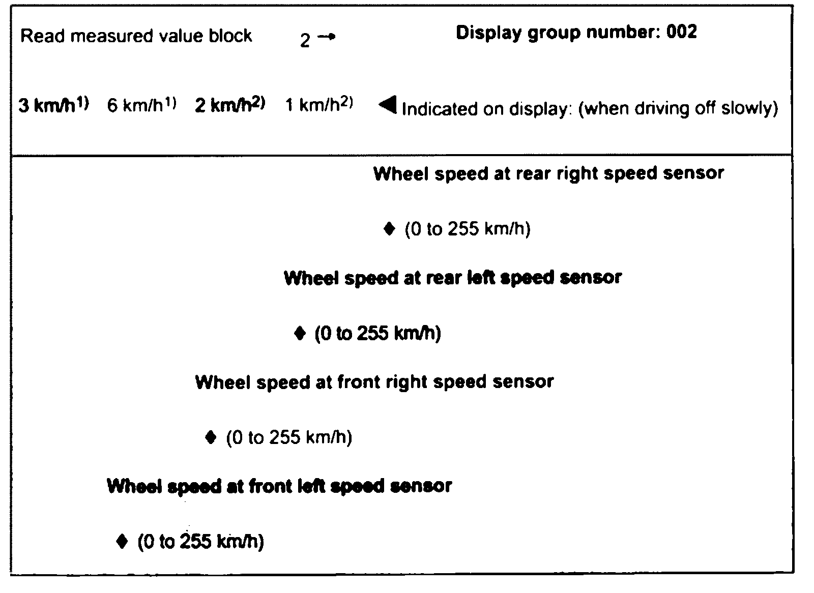 The reading of measured value blocks in display group number 002 must be undertaken when driving off slowly. Then the control module -J104- will store the first usable voltage signals provided by the speed sensors and display these as a fixed value in the measured value block.