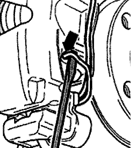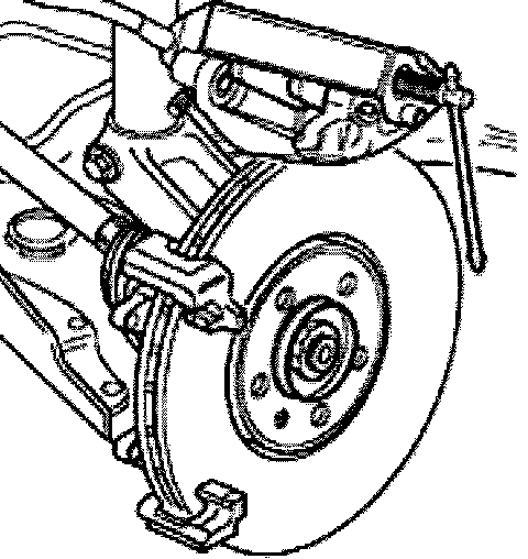 ^ Remove brake caliper housing and secure with wire so that weight of brake caliper does not stress or damage brake hose.