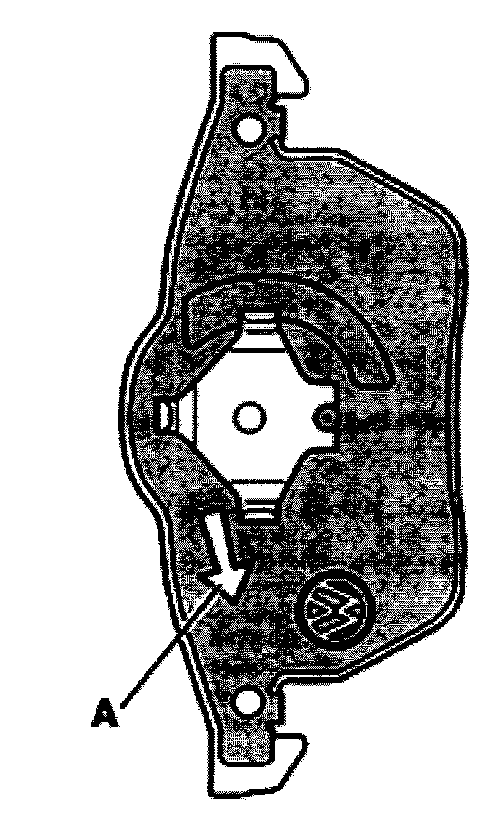When the brake pad is installed, the arrow on the brake pad backing plate -A- must point downward. Ensure that the brake pad is installed correctly!