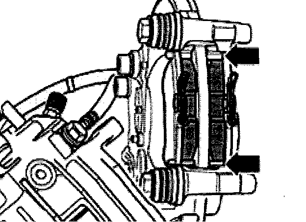 ^ Remove brake pads and pad retaining springs (arrows).
