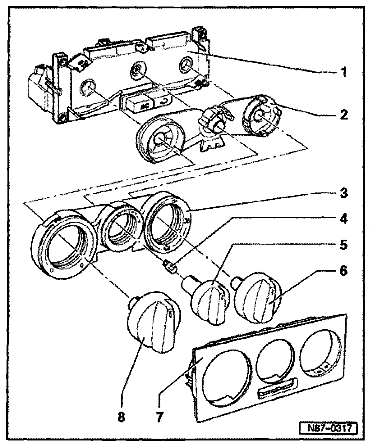 - Unclip trim panel - item 7 - and rotary control - item 5 -.