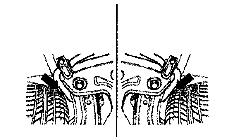 Distance between front axle components and tires (arrow) must be even at full lock (full turn left/right)