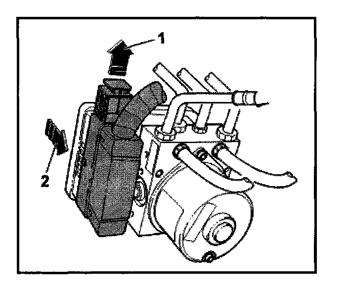 <-- Release ABS control module electrical connector by pulling latch upward -arrow 1-