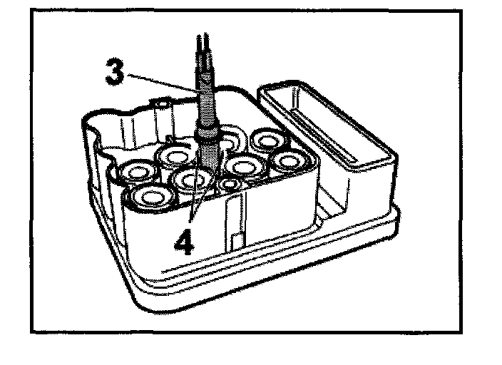 ^ Install pump and hydraulic unit with new ABS control module onto bracket in vehicle and hand start previously removed screws