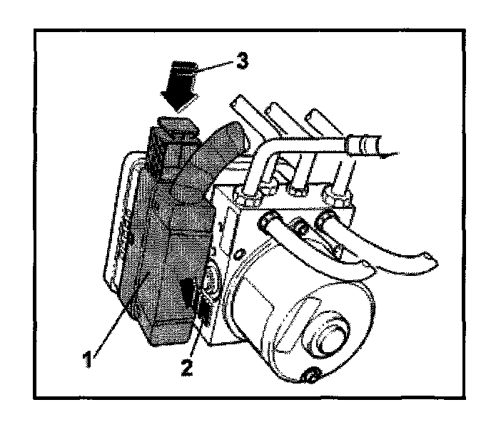 <-- Lock electrical connector to ABS control module by pushing latch down -arrow 3-