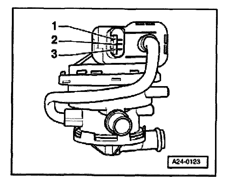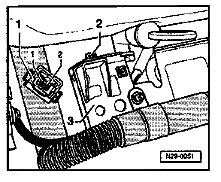 - Pull connector off solenoid valve -1- and connect VAG1527B voltage tester with auxiliary cables from VAG1594 to disconnected connector contacts 2+3.