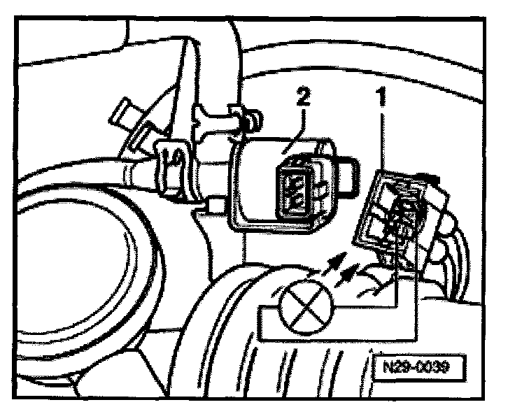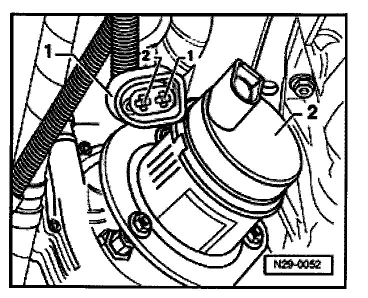 - Pull 2 pin connector -1- off secondary air injection pump motor -2- and connect VAG1527B voltage tester with aux. cables from VAG1594 to disconnected connector.