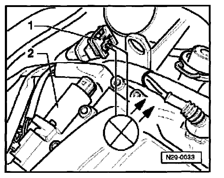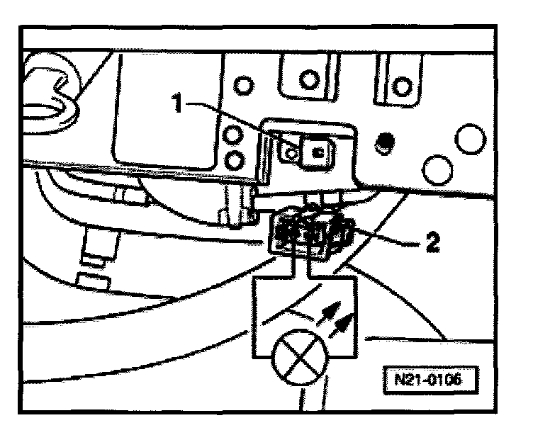 - Pull connector -1- off solenoid valve -2- and connect VAG1527B voltage tester with adapter cables from VAG1594 to disconnected connector.