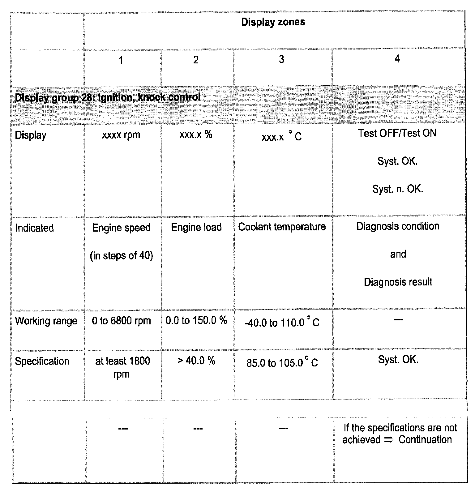 - Perform a test drive and check knock control specifications on display (display zone 4)