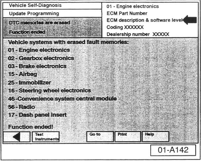 After switching ignition ON, the ECM has been re-initialized, however, fault memories must now be erased.