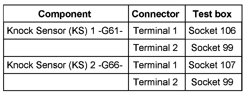 - Measure resistance between terminals 1 + 2 at connectors to knock sensors. Specified value: Infinite Ohms