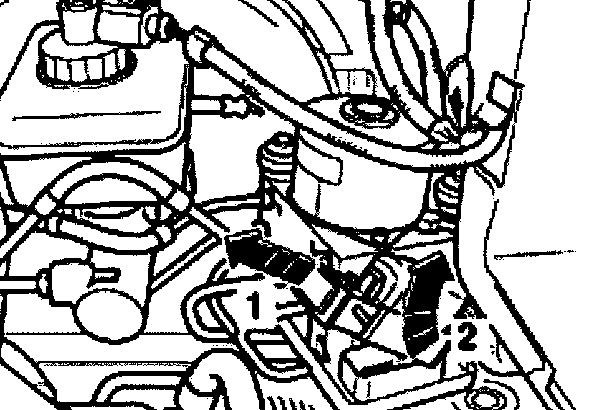 ^ Pull off intake hose -1- and connector -2- from Mass Air Flow (MAF) sensor.