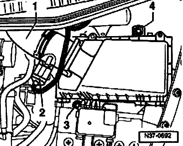 ^ Release control module -J104- connector -arrow 1- and pull off arrow 2-.