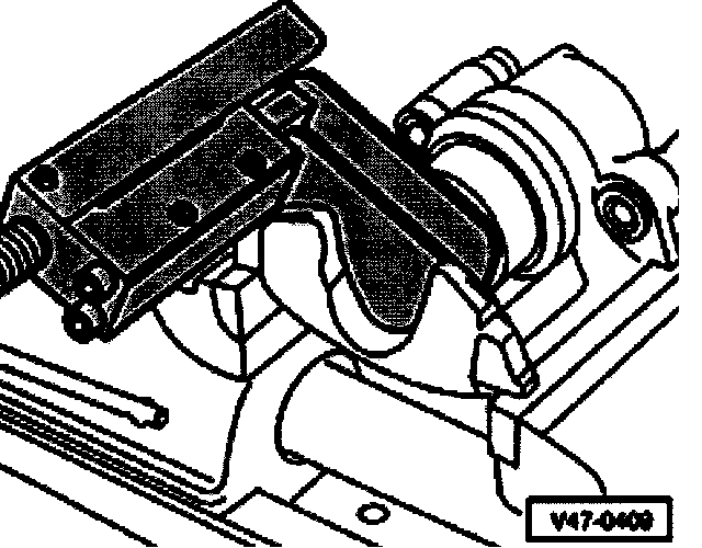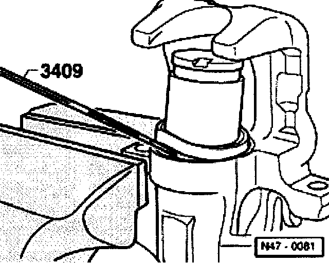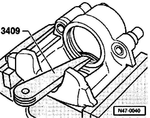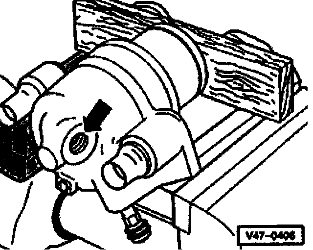 ^ Hold piston in front of caliper and insert inner sealing lip into groove in cylinder using wedge 3409.