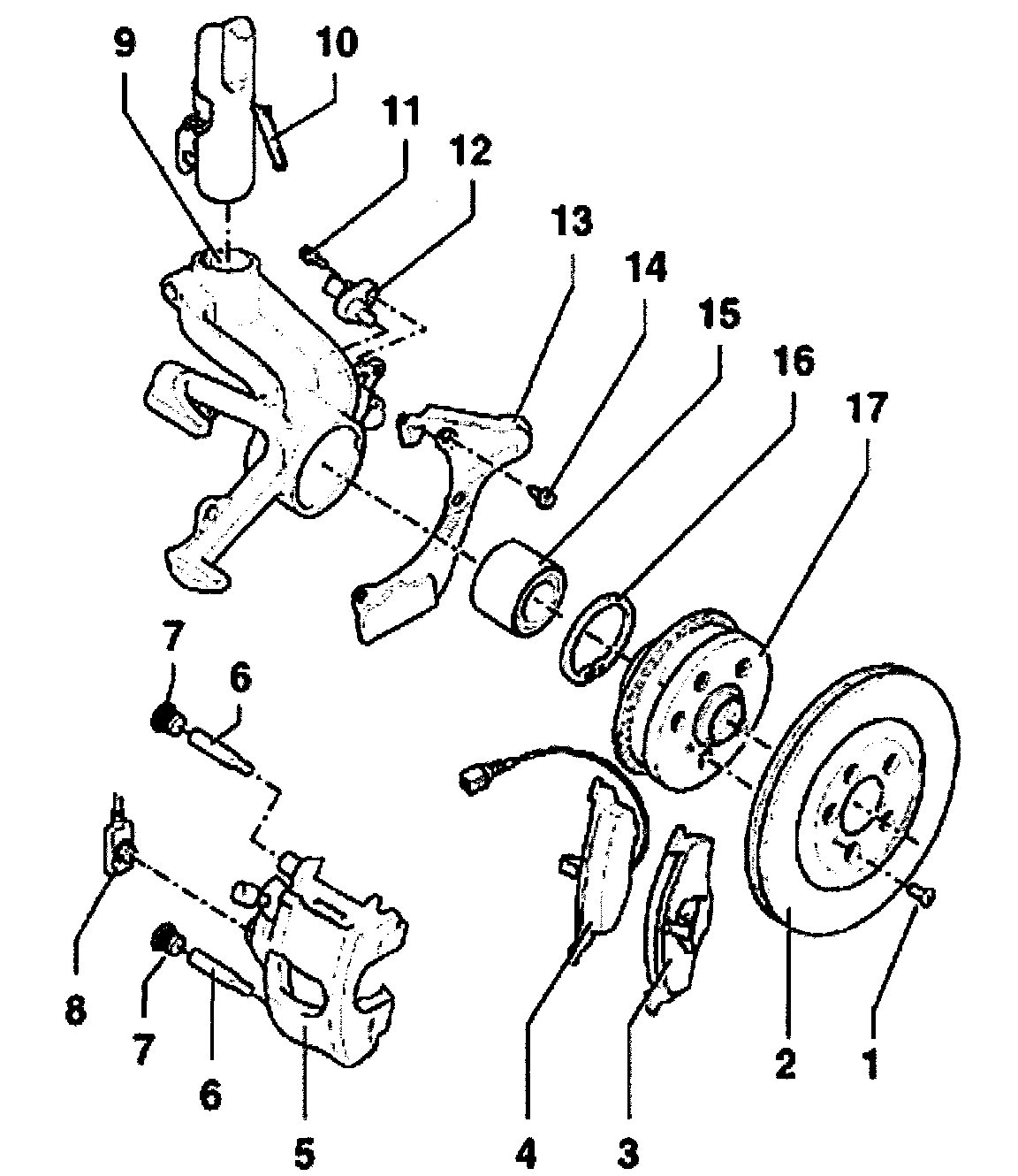Note: Before removing a caliper or disconnecting a brake hose to the caliper, install the brake pedal depressor VAG 1869 or equivalent.